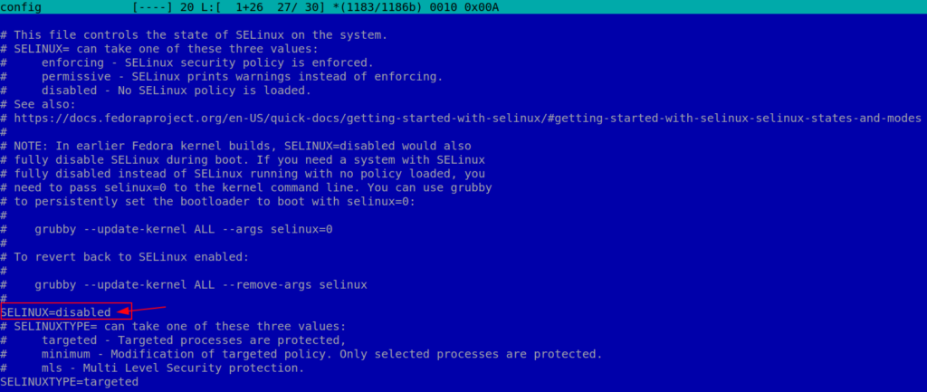 Затем измените директиву SELinux=enforcing на SELinux=disabled, как показано на рисунке ниже.