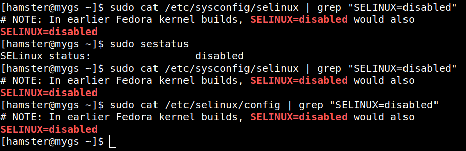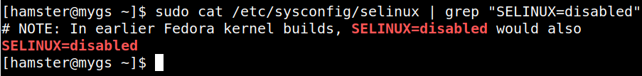 $ sudo cat /etc/sysconfig/selinux | grep "SELINUX=disabled" $ sudo cat /etc/selinux/config | grep "SELINUX=disabled"