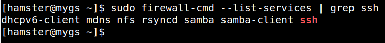 $ sudo firewall-cmd --add-service=ssh --permanent $ sudo firewall-cmd --reload $ sudo firewall-cmd --list-services | grep ssh