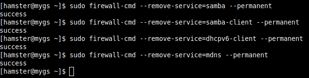 $ sudo firewall-cmd --remove-service=cockpit --permanent $ sudo firewall-cmd --remove-service=dhcpv6-client --permanent $ sudo firewall-cmd --remove-service=mdns --permanent $ sudo firewall-cmd --remove-service=samba --permanent $ sudo firewall-cmd --remove-service=samba-client --permanent