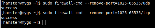 $ sudo firewall-cmd --zone=public --remove-port=1025-65535/udp $ sudo firewall-cmd --remove-port=1025-65535/udp $ sudo firewall-cmd --remove-port=1025-65535/tcp $ sudo firewall-cmd --remove-port=1025-9089/tcp $ sudo firewall-cmd --remove-port=9091-65535/tcp