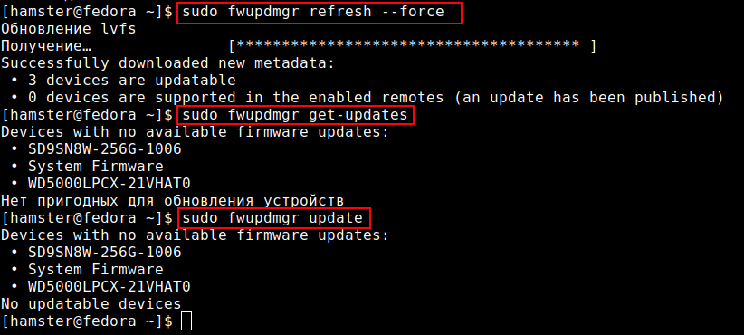 Если производитель вашего оборудования поддерживает специальный пакет встроенного программного обеспечения для Fedora KDE Plasma, вы можете быстро проверить его и получить эти обновления, выполнив следующую последовательность команд. Однако это может быть не всегда доступно, но попробовать стоит.