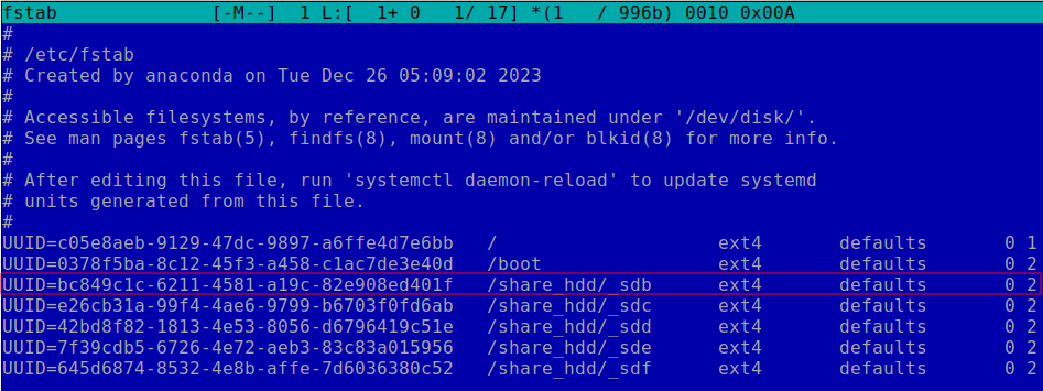 UUID=bc849c1c-6211-4581-a19c-82e908ed401f /share_hdd/_sdb ext4 defaults 0 2