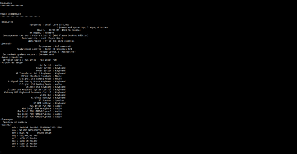 • Информация о процессоре, памяти, графической карте и других аппаратных компонентах;